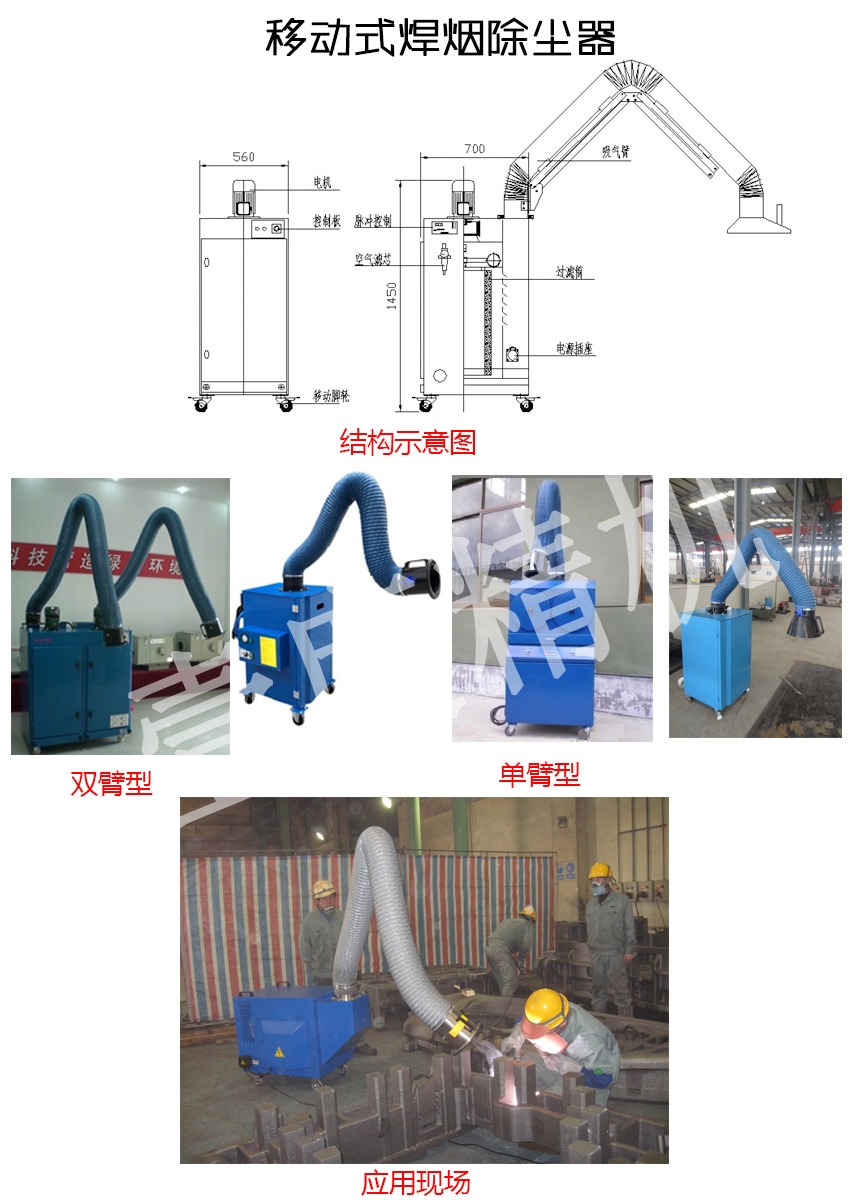 用于焊接、拋光、切割、打磨等工序中產(chǎn)生煙塵和粉塵的凈化以及對稀有金屬、貴重物料的回收等,可凈化大量懸浮在空氣中對人體有害的細(xì)小金屬顆粒。具有凈化效率高、噪聲低、使用靈活、占地面積小等特點(diǎn)。適用于電弧焊、二氧化碳保護(hù)焊、MAG焊接、碳弧氣刨焊、氣熔割、特殊焊接等產(chǎn)生煙氣的作業(yè)場所。